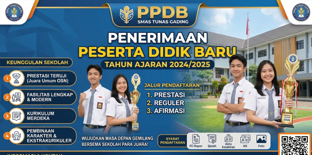 SMAS Tunas Gading, sekolah dengan akreditasi B yang berlokasi strategis di Kelapa Gading, Jakarta Utara, kembali membuka kesempatan bagi putra-putri terbaik bangsa untuk bergabung dalam keluarga besar kami. Kami berkomitmen mencetak generasi yang unggul dalam akademik, berkarakter, dan siap menghadapi tantangan global dengan Kurikulum Merdeka.